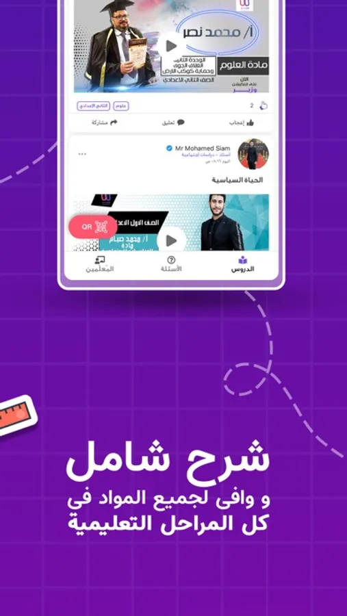 تطبيق لدعم طلاب المراحل المختلفة من دروس ومراجعات لكل المواد يقوم المدرسين بأضافة الدروس والفديوهات لكل مادة دراسية ويمكن للطالب اضافة سؤال فى مادة ويتم الرد عليه من خلال المدرس المتخصص للماده
