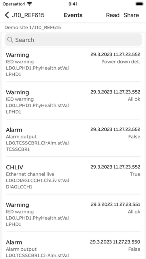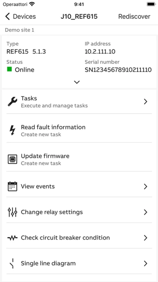 Using RXplore it is possible to create a site, scan a network and identify supported ABB devices in the network. Once the device is identified and connected, it is possible to perform operations like parameterization (modify editable settings of relay), read events and fault information. Events and fault information read from relay can be shared for further analysis.