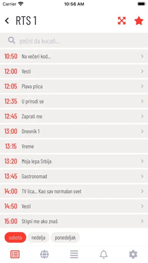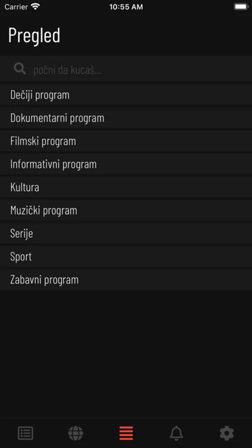 - Pregled - prikaz kanala po tipu. Postoji devet tipova: filmovi, sport, vesti, crtani filmovi, dečiji program, dokumentarni program, kvizovi, muzički program, serije.