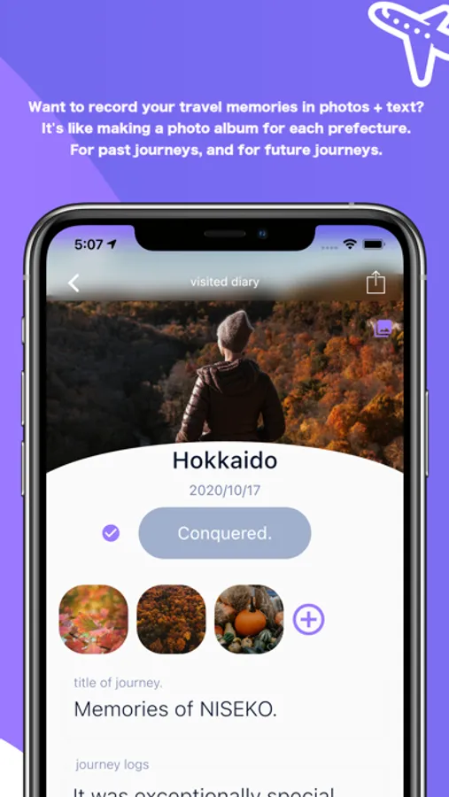 We developed this app to provide you with the peace of mind that you can look back on your memories of past and future trips with photos and text, feel refreshed, share them with friends, spark conversation, and laugh.
