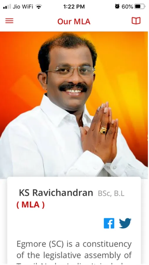 This app is to showcase the work of MLA (member of legislative assembly) Mr. K. S. Ravichandran of Egmore constituency of state Tamilnadu, India. The features of the app are: