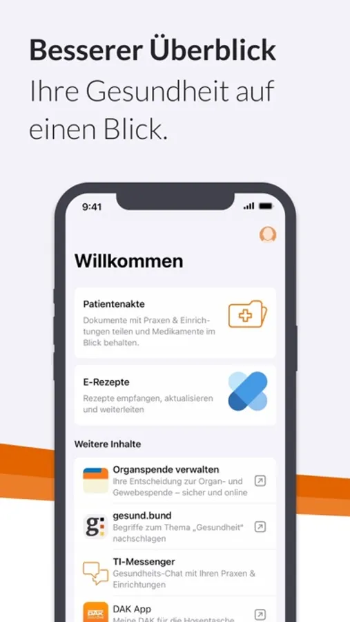• Praktische Zusatzfunktionen: E-Rezepte einsehen und einlösen sowie Zugang zum neuen Organspende-Register.