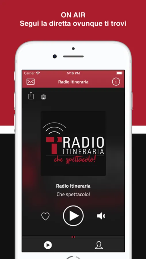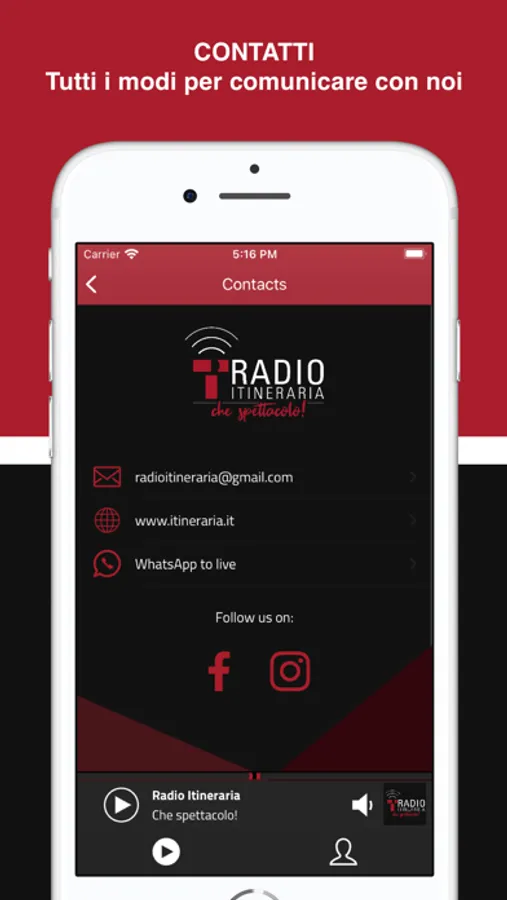 L'App ufficiale di RADIO ITINERARIA ti permette, con un click, di restare sintonizzato in diretta con l'emittente di Itineraria Teatro, che trasmette h24 programmi sul mondo dello spettacolo, sui temi del nostro Teatro Civile (prevenzione droga, contrasto all'azzardo, finanza etica, acqua bene comune, immigrazione e razzismo, bullismo e cyberbullismo...) e non solo.