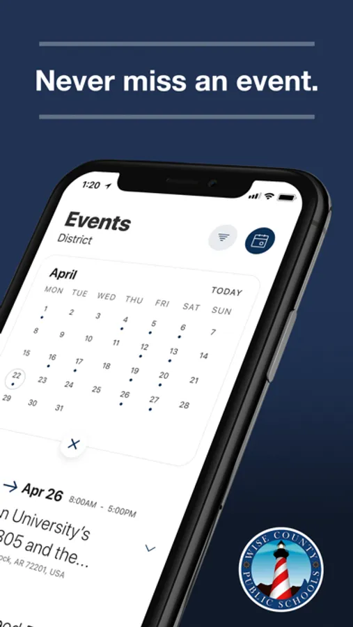 The event section shows a list of events throughout the district. Users can add an event to your calendar to share the event with friends and family with one tap.