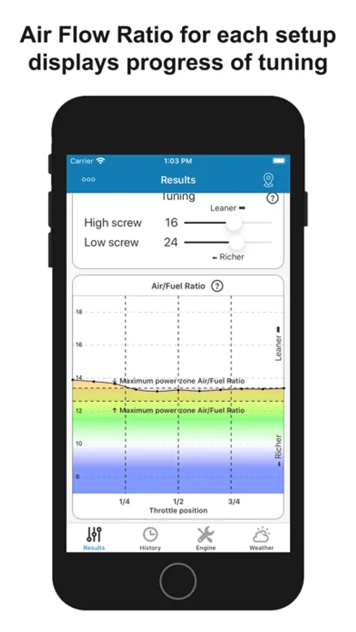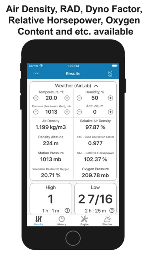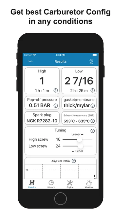 • Results: In this tab high speed screw position, low speed screw position, pop-off pressure, gasket & membrane reccomendation, spark plug, optimal exhaust temperature (EGT) are shown. These data are calculated depending on the weather conditions and the engine configuration given in the next tabs. This tab lets do a fine tuning adjustment for all this values to adapt to the concrete engine. Also the air density, density altitude, relative air density, SAE - dyno correction factor, station pressure, SAE- relative horsepower, volumetric content of oxygen, oxygen pressure are shown too. On this tab, you can also share your settings with your colleagues. You can also see in a graphic form the calculated ratio of air and fuel (lambda).