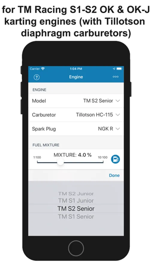 This app provides, using temperature, altitude, humidity, atmospheric pressure and your engine configuration, a recommendation about optimal carburetor config (jetting) for karts with TM Racing OK & OK-Junior engines (S1 and S2 models) which use a Tillotson diaphragm carburetors