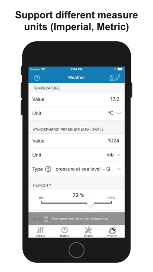 • Weather: In this tab, you can set the values for current temperature, pressure, altitude and humidity. Also this tab allows to use the GPS to get the current position and altitude, and connect to an external service (you can choose one weather data source from several possible) to get the weather conditions of the nearest weather station (temperature, pressure and humidity). In addition, this application can work with a pressure sensor built into the iPhone. You can see if it is available on your device and turn it on or off. Also, on this tab, you can enable alerts about possible carburetor icing.