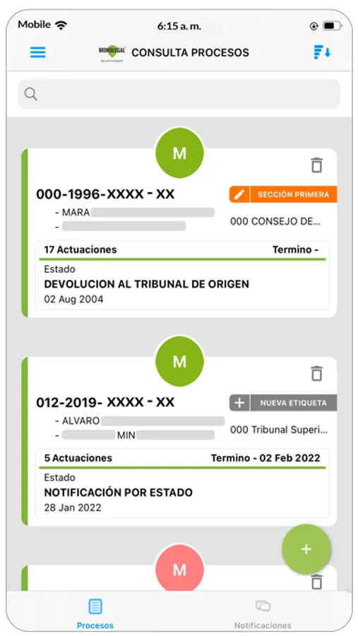 Consultamos diariamente la fuente de datos oficial de Consulta Procesos de la Rama Judicial de Colombia y te notificamos las nuevas actuaciones a tu correo electrónico, aplicación móvil y plataforma web accediendo desde https://monolegal.co