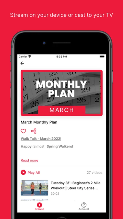 The Walk at Home App features a monthly plan of videos called Your Daily Walk! Plus access to hundreds of workouts in the Walk at Home library.