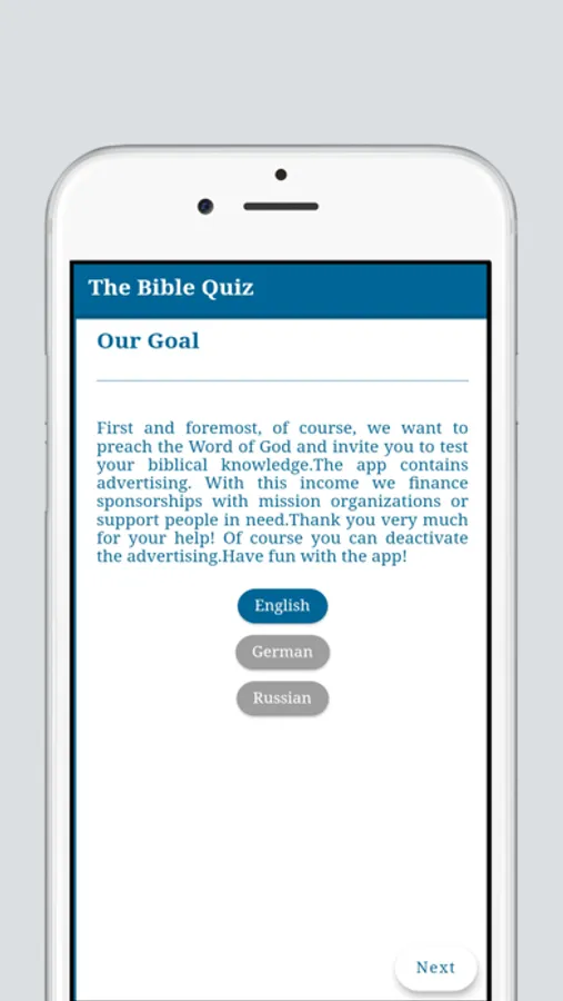 This game contains advertising. Through income from advertising, "The Bible Quiz" finances sponsorships in cooperation with the missionary organization "To All Nations". The advertising can be deactivated by an in-app purchase. Thank you for your understanding and your help!