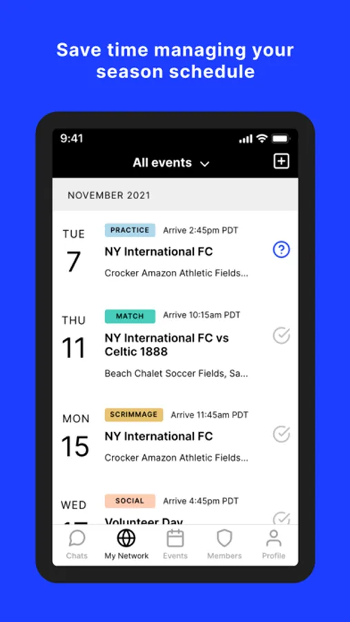 Configura fácilmente juegos, prácticas, y eventos sociales.