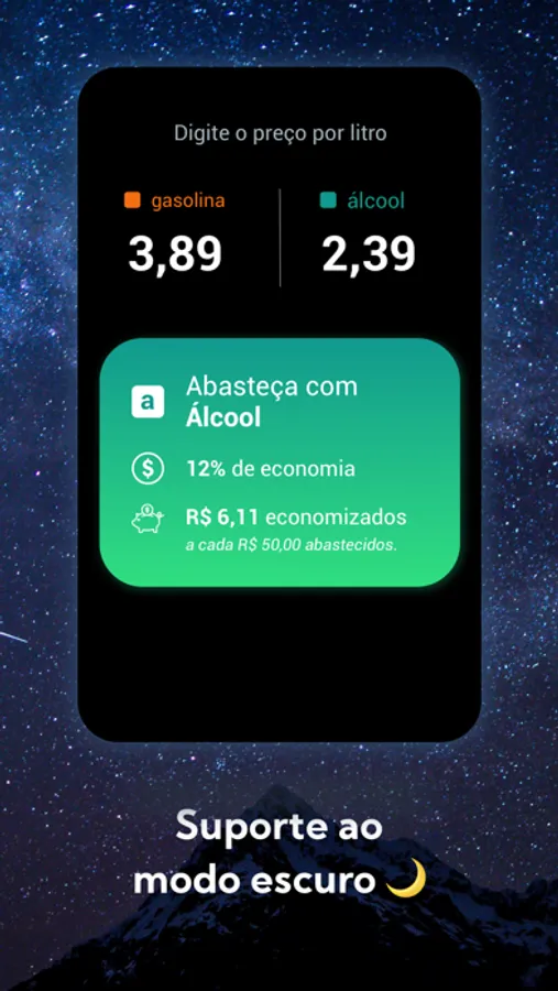 - Você chega para abastecer no posto, abre o app e digita o valor do litro do álcool e da gasolina anunciados;
