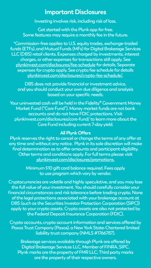 (1) $10 Sign Up Offer: Limited-time offer for DBS brokerage account owners; a Paxos crypto account is not required to be eligible for this offer. Other limitations apply. See plynkinvest.com/disclosures/promotions for details. You can invest your bonus in stocks or funds as soon as it’s deposited into your brokerage account or you can also buy crypto or transfer your bonus 30 days thereafter.