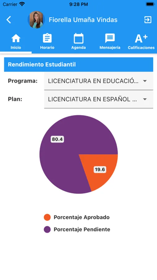• Progreso en Plan de Estudios: muestra un gráfico que resume el estado del plan de estudios en curso, podrás visualizar el porcentaje de las asignaturas aprobadas y pendientes por aprobar. Además, CLASS te mostrará el detalle de las asignaturas que conforma dichos porcentajes.