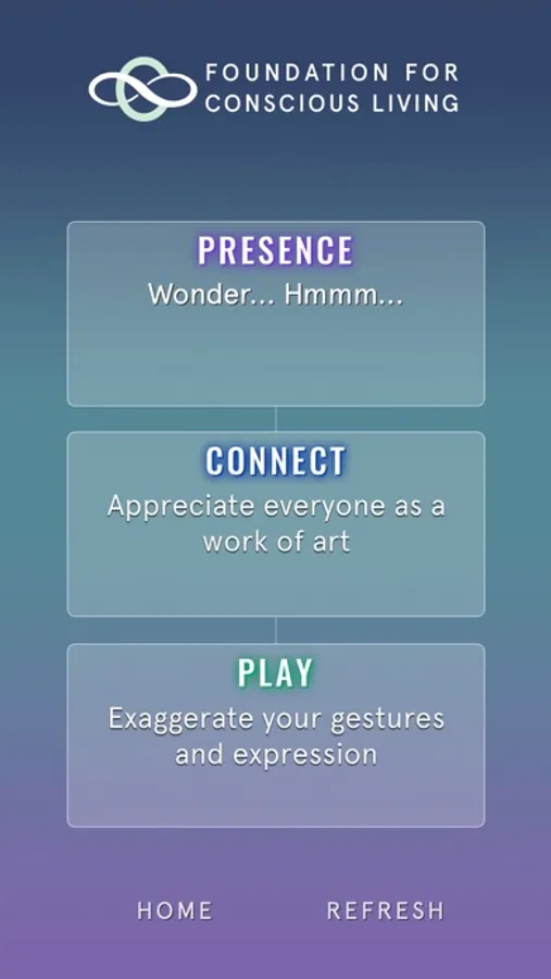 The Foundation for Conscious Living’s Presence-Connect-Play app offers invitational prompts to support you presencing in the current moment, connecting with others and your environment, and creating playful interactions.