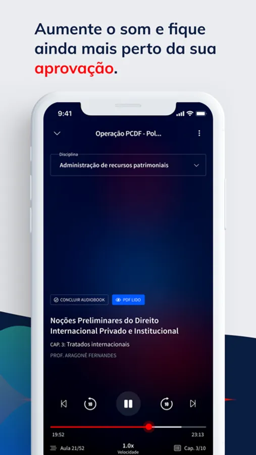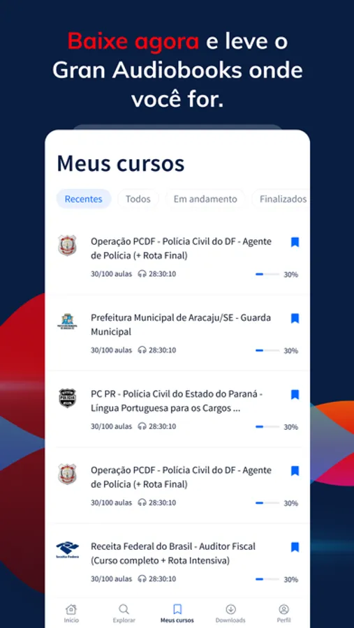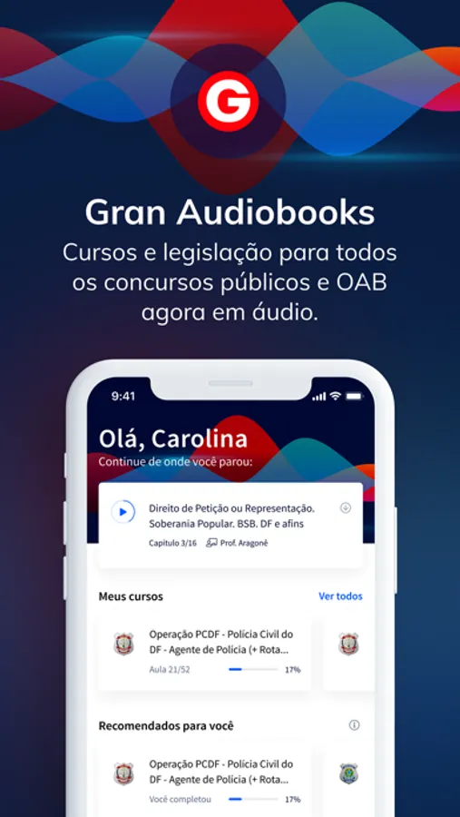 Pensado em cada detalhe para que você tenha a melhor experiência com essa tecnologia de ponta, na aba “Meus Cursos”, do Gran Audiobook, você poderá acompanhar em que momento está nos seus estudos. Além disso, um app que faz recomendações que tenham a ver com o seu jeito, com seus objetivos, além de indicar os concursos mais procurados. Se tempo era o seu problema, baixe agora este aplicativo com o maior acervo de audiobooks para concursos e OAB do Brasil.