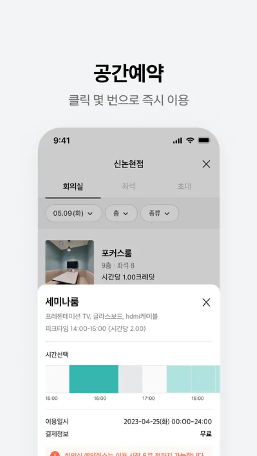 회의실, 세미나룸, 스튜디오 등 다양한 공간을 편하게 예약