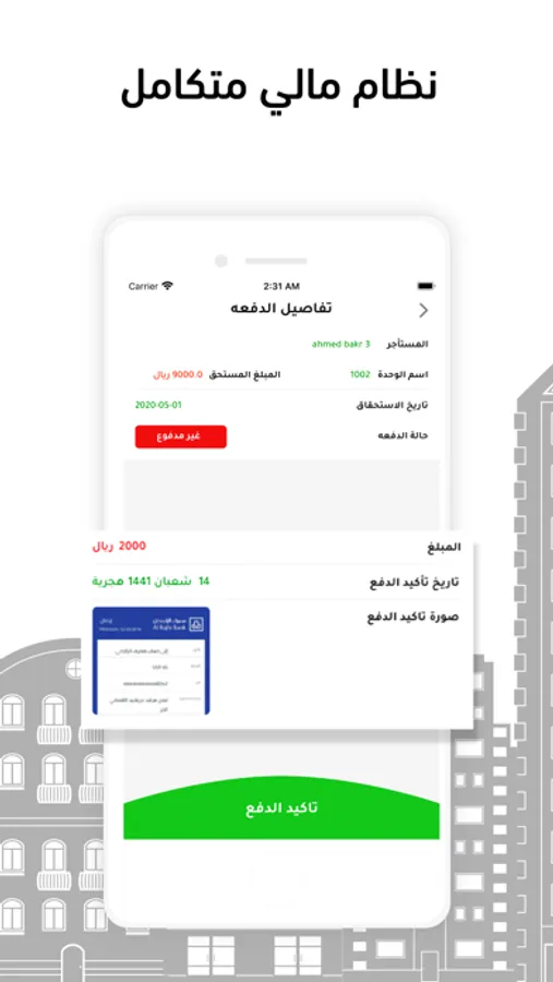 يضمن لك تطبيق وكد إدارة الدفعات المستحقة والمتاخرة و تحصيل الإيجار الخاص بالعقود بالإضافة إلى متابعة العملاء ماليا .
