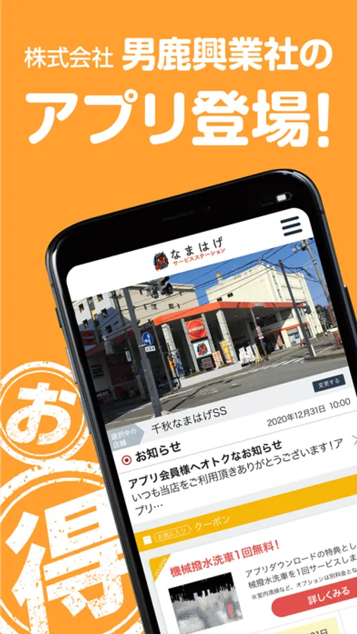 「なまはげサービスステーション」のダウンロード・ご利用は無料です。アプリダウンロード後にご希望の店舗をご登録の上、ご利用ください。