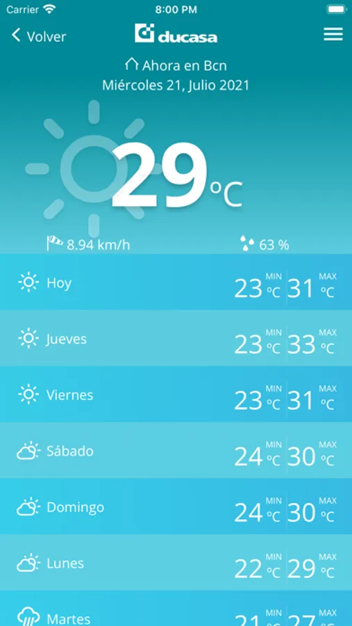 • PREVISIÓN METEOROLÓGICA de 7 días, temperaturas máximas y mínimas, velocidad del viento y humedad relativa.