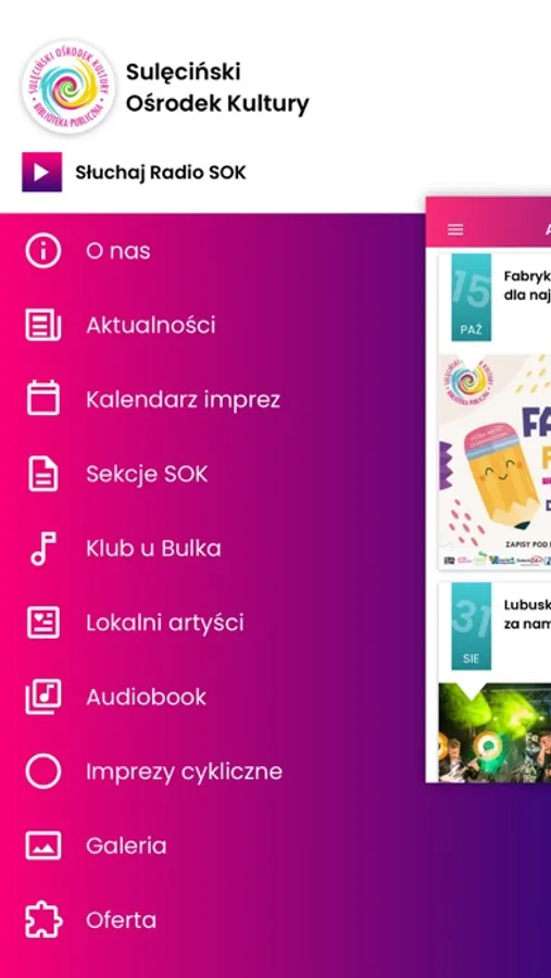 Wciągnij się w kulturalną sieć - SOKowirówka to aplikacja mobilna Sulęcińskiego Ośrodka Kultury, dzięki której nie tylko dowiesz się wszystkiego o najbliższych wydarzeniach, ale także masz dostęp do rezerwacji biletów, transmisji na żywo Radia SOK, wydarzeń on-line i audiobooka - "Bajki o Sulęcinie", polecamy także rozrastającą się bazę lokalnych artystów.