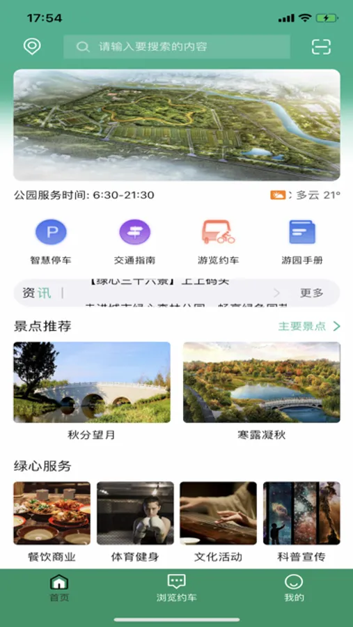 游客游园前可通过游园手册、交通指南、绿心资讯等了解绿心公园, 在特殊时期可使用预约入园提交入园申请, 自驾入园的游客通过智慧停车功能可提前查看园内停车场情况、预约车位;游园中通过地图功能可查看所有景点位置并获取详细介绍, 游览约车功能可预约园内的观光车或扫码使用自行车, 游览时用扫码功能扫描植物标牌可获得植物的百科介绍; 绿心服务中还有对园内餐饮、体育、文旅等各板块的活动介绍及入口, 体育场馆开放后, 可通过app 预约场馆;紧急情况下, 可通过扫码扫描灯杆或坐椅二维码进行求助, 将定位快速发送到指挥中心;游园后, 可提交建议或意见给绿心运营管理团队, 帮助更好完善当前服务