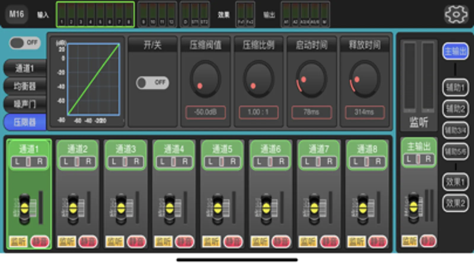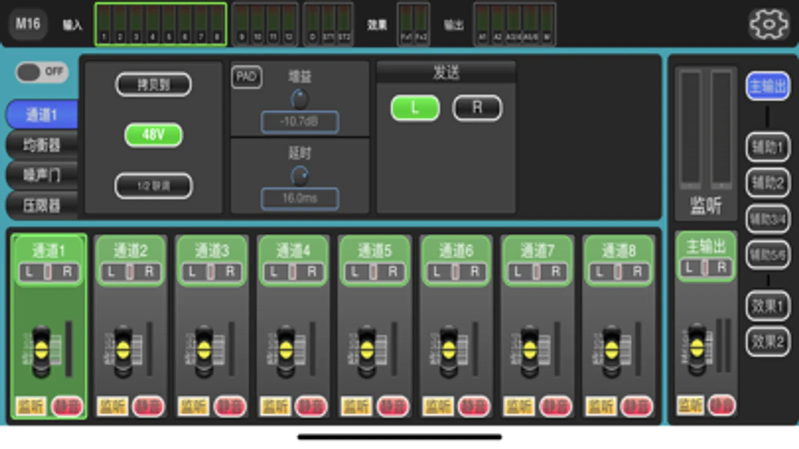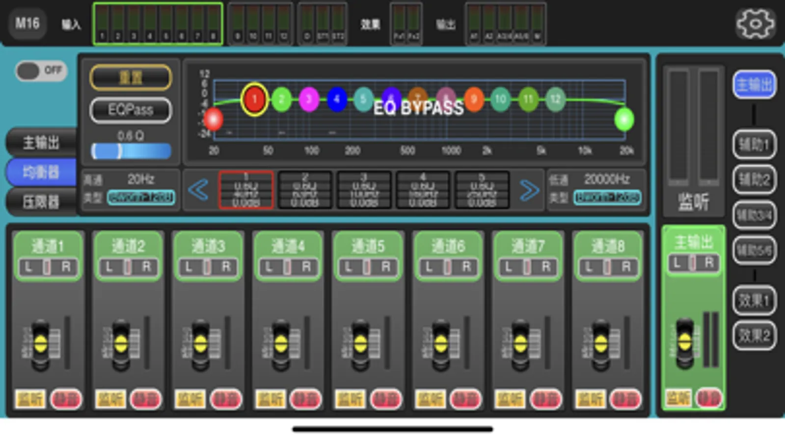 •・输出处理:高低通滤波,12段参量均衡(GEQ支持通过在推子上操控),压缩器,延时,相位