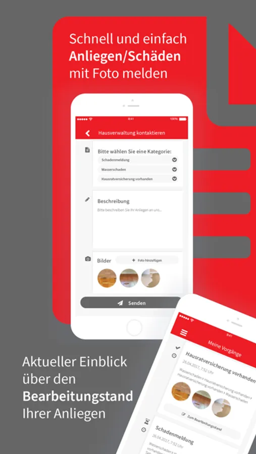 Als Mieter oder Eigentümer können Sie Schäden oder Anliegen direkt mit Fotos über unsere App melden. Ihre Anfragen stehen unseren Mitarbeiten dann zur Verfügung und können auch an Handwerksbetriebe weitergeleitet werden.