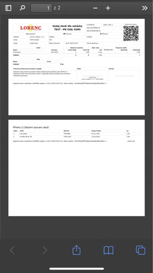 Pomocí QR kódu na průvodce můžete načíst údaje z průvodky v elektronické formě. Průvodka se zobrazí včetně všech dostupných příloh (PDF protokol, fotografie zboží, apd..). Průvodku je možné následně stáhnout nebo si ji odelsat na email.