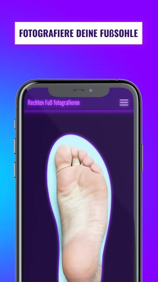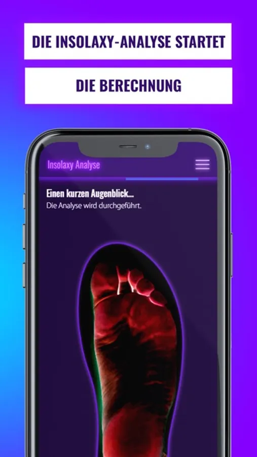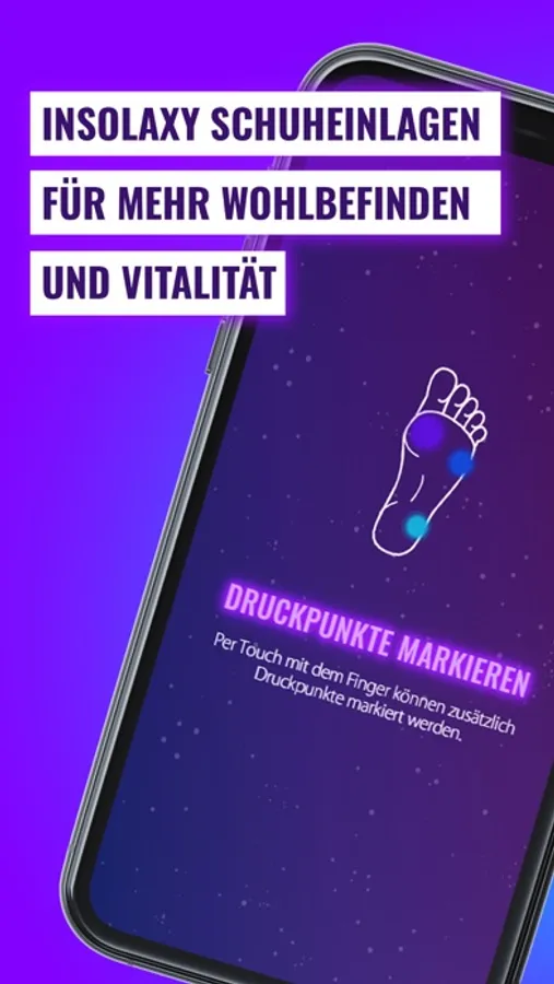 Mach mit deiner Kamera Bilder deines linken und rechten Fußes. Platziere deine Fußsohlen genau in die Vorlage und definiere per Tap Druckpunkte, die du unangenehm spürst. Nach der Bildaufnahme startet die Insolaxy-Analyse zur individuellen Erstellung der Einlagen. Im Hintergrund werden deine Daten berechnet.