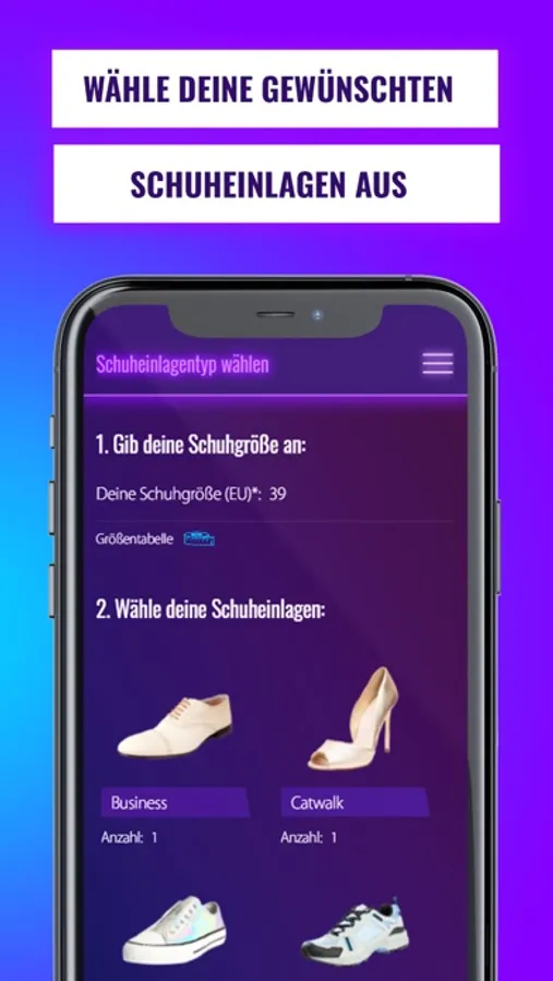 Zuletzt wählst du aus den vorhandenen Einlagen (Sport, Sneaker, Catwalk, Business) deine Modelle aus und kannst dich auf deine baldige Lieferung freuen