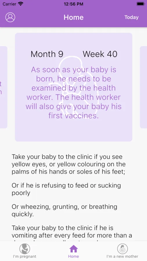 The app features important information, advice and tips organized according to the stage of pregnancy and age of newborn to help ensure both mother and baby are safe and healthy.