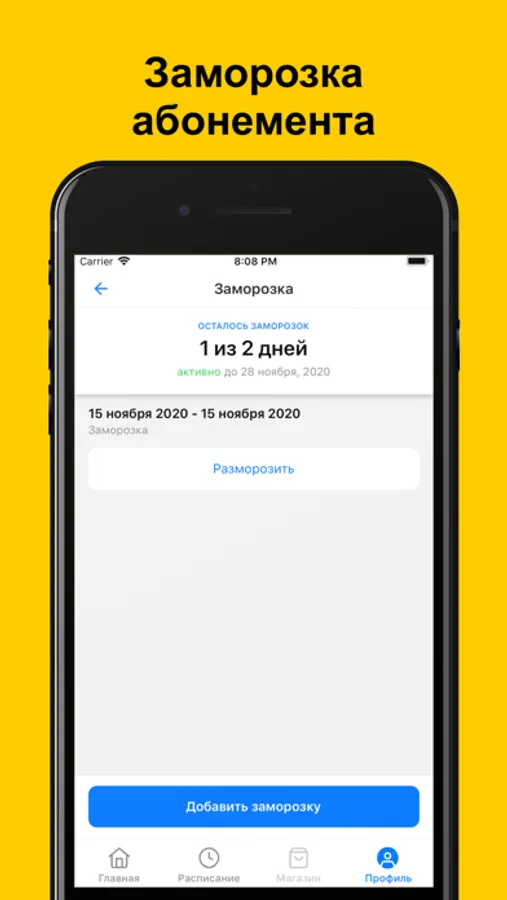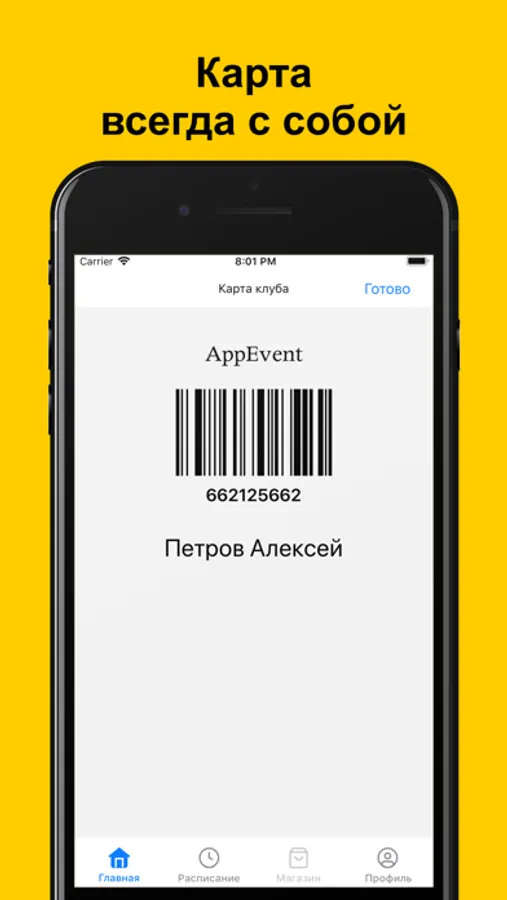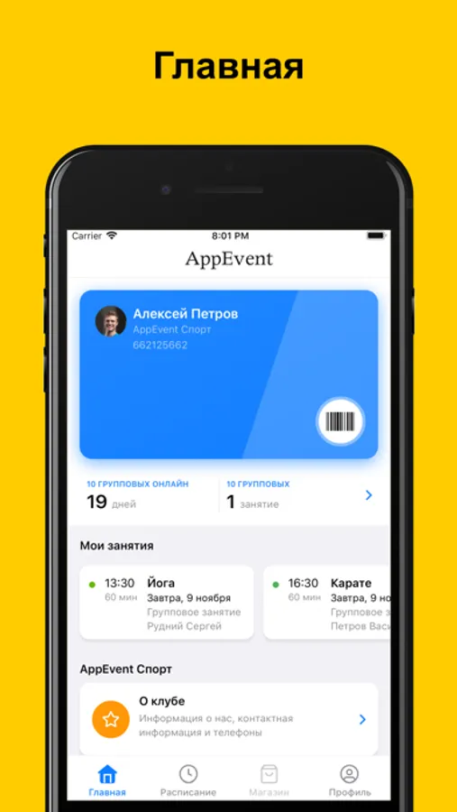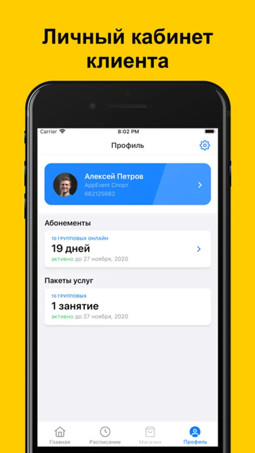 Приложение для фитнес клуба, студии танцев и спортивного учреждения. Ваши клиенты всегда будут в курсе актуального расписания, остатка услуг и смогут продлить абонемент самостоятельно, оплатив банковской картой.