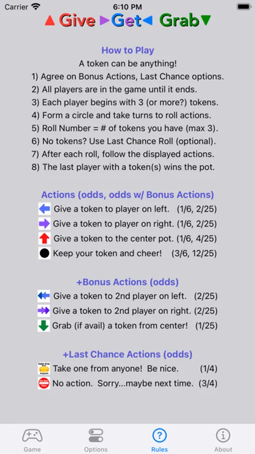 Version 2 added even more fun for everyone. If you enable the "Last Chance Roll" option, players without any tokens can attempt the "Last Chance Roll" and have a 1/4 chance to take a token from anyone.
