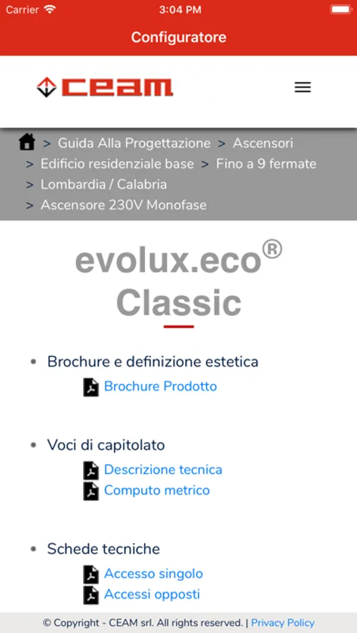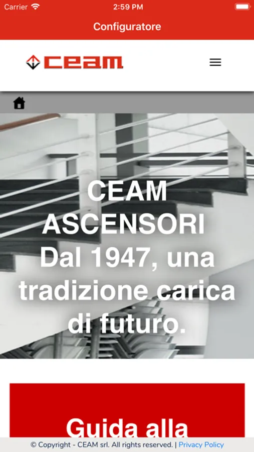 Indicando semplicemente il tipo di edificio in cui desideri installare il tuo impianto, le sue fermate e la regione/provincia di installazione, la Guida ti porterà alla corretta selezione del tuo impianto, in termini di tipo, dimensioni, velocità e accessori, tenendo conto di tutte le normative in vigore a livello nazionale e locale, della qualità del servizio necessaria e degli oltre 70 anni di esperienza Ceam.
