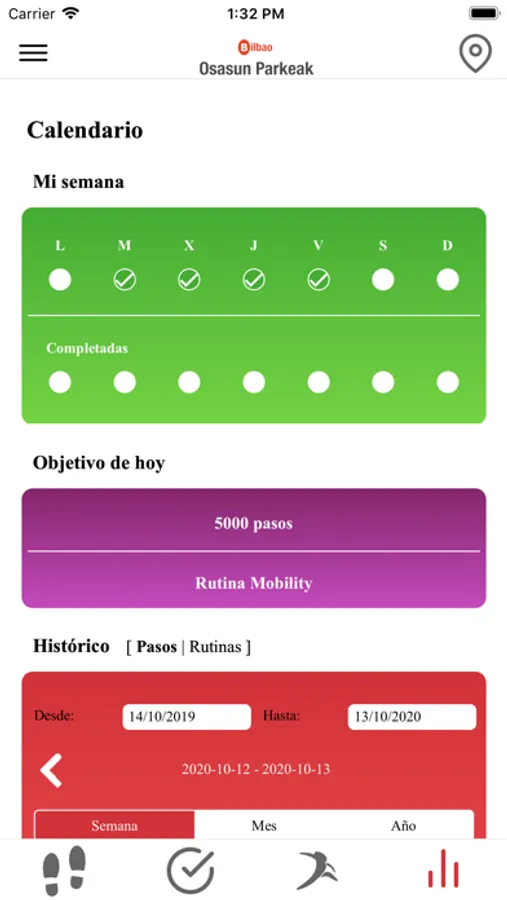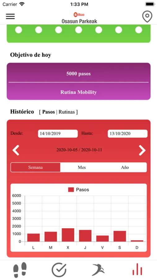 La aplicación almacena un historial de actividad (pasos y rutinas) que el usuario puede consultar en todo momento. Estos datos se recuperan del dispositivo a través de la integración con la aplicación de Salud (Health app).