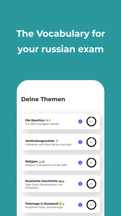 Mit dieser App gelingt es dir spielerisch, alle Prüfungsthemen zu lernen und ohne Probleme auf russisch über sie zu reden.