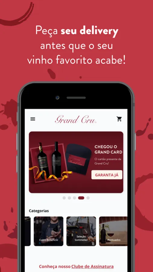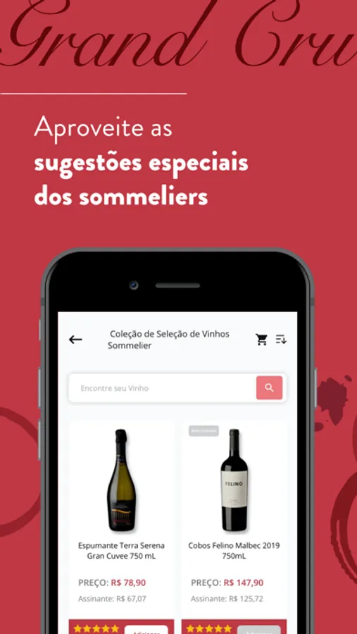 O App Grand Cru oferece uma melhor experiência de compras, com campanhas e condições exclusivas. Escolha entre algumas das melhores vinícolas do mundo como Allegrini, Leyda, Errazuriz, Cobos, Vega Sicilia, San Marzano, Zuccardi, Niepoort, Barone Montalto e muitas outras.