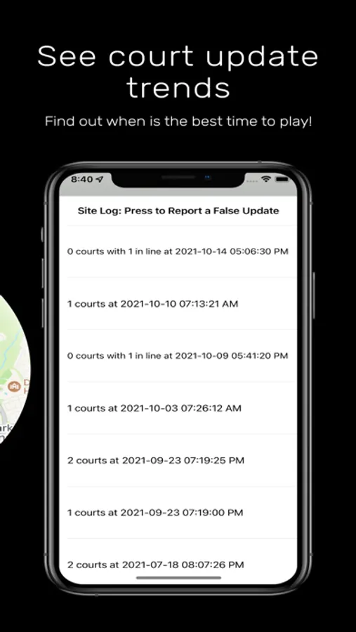 The days of waiting in line at public tennis courts are long gone. Now, you can check to see which sites near you are free before you head out for a hit. See how many courts are open at a given time AND view detailed update trends over time. Users can also see how long the line was when there were no courts available.