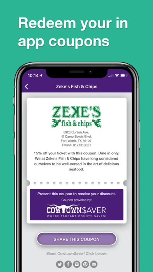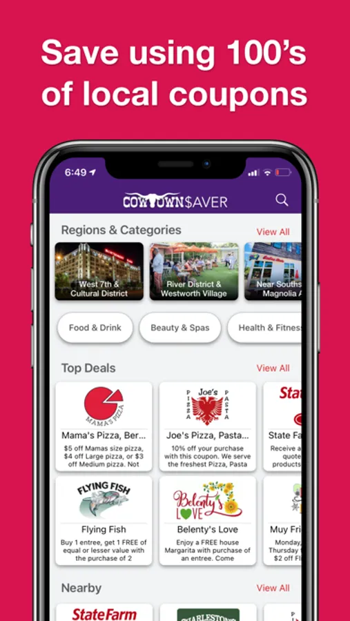 The CowtownSaver App was designed for the greater Fort Worth Community, including the neighboring cities in Tarrant County, TX. We accumulate coupons and discounts from 100's of local businesses who offer their savings to consumers. The consistency of the coupon offering promotes recurring use and customer loyalty. Discounts can range between 10% - 50% off the regular price for Food & Drink items at restaurants, Automotive services, Beauty services, Clothing & Accessories, Home Goods, Entertainment, and more.