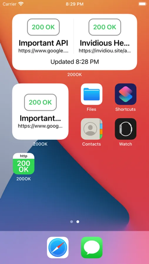 200OK pings those APIs once every few minutes (depends on when iOS refreshes the Widget), you can see the most recent status of the API on your home screen. A report is also available within the app for quick diagnosis, whether it is a success with response data, or an error with error message/code.