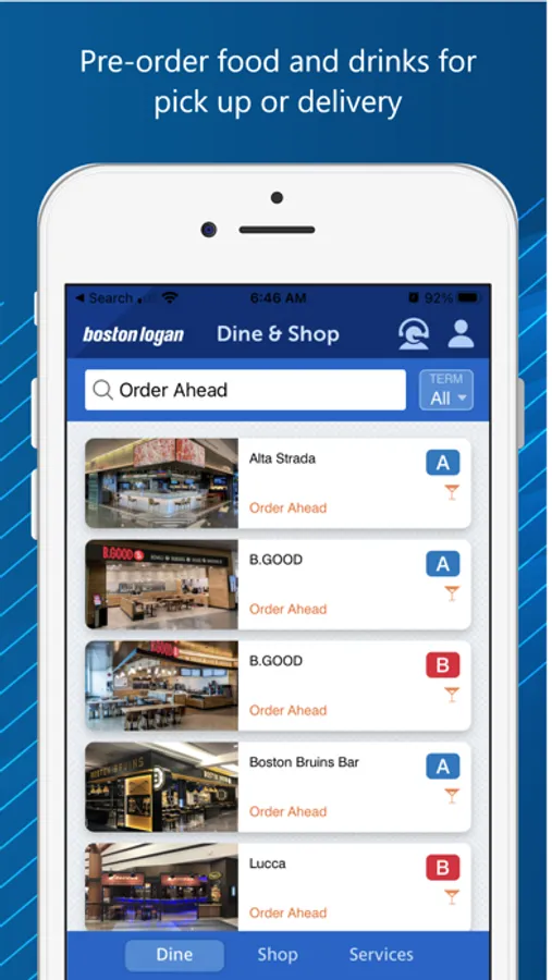 • Order food and have it delivered to your gate with BOS2Go