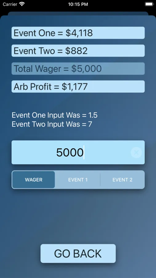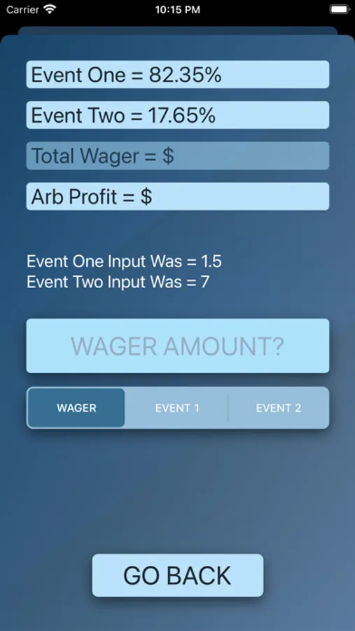 4) Assuming you have an opportunity, the calculator will tell you what percentage of your total wager to bet on each event. The arbitrage profit percentage is also displayed!