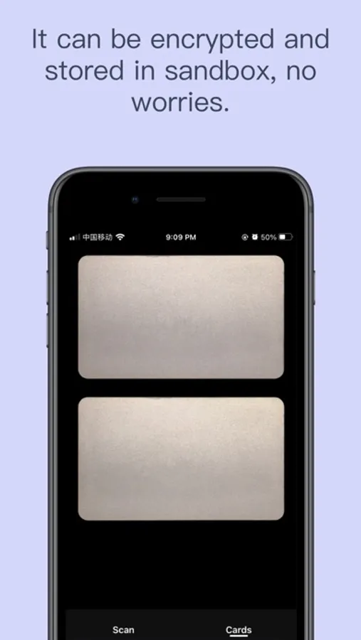 The card is scanned in a pure mobile phone environment without any networking behavior. The scanned photos are encrypted and stored in the mobile phone sandbox, which cannot be obtained and read by others, ensuring the privacy and security of the card.