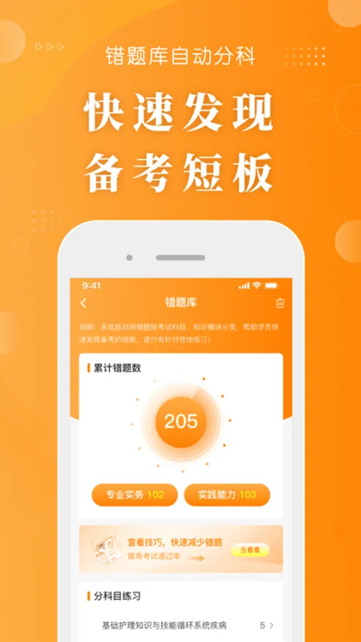 错题库:自动按考试科目、知识模块分类,助你快速发现备考短板,快速提升薄弱知识!