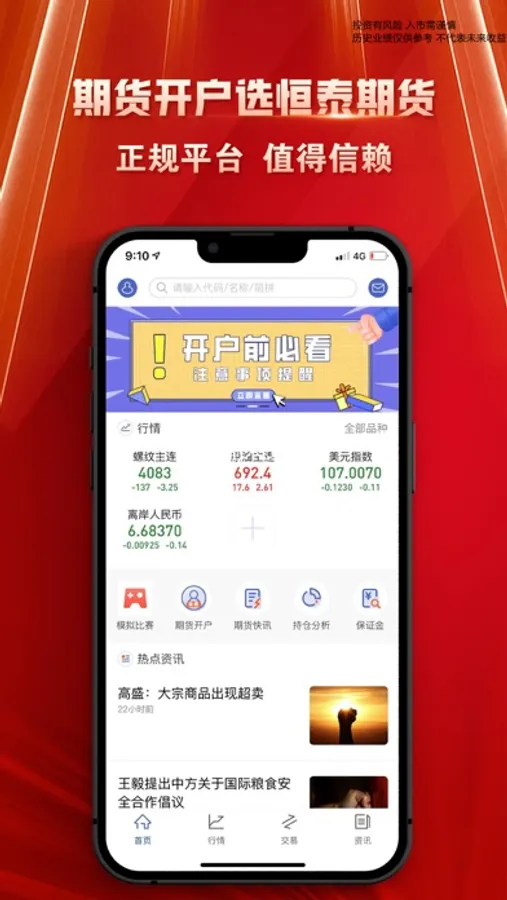 用户可使用恒泰期货APP办理期货网上开户业务,是安全可靠的期货交易软件。支持期货资讯服务。支持期货交易快速下单、止盈止损功能,支持资金信息、保证金率、持仓信息、成交信息及结算单查询易。