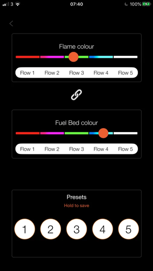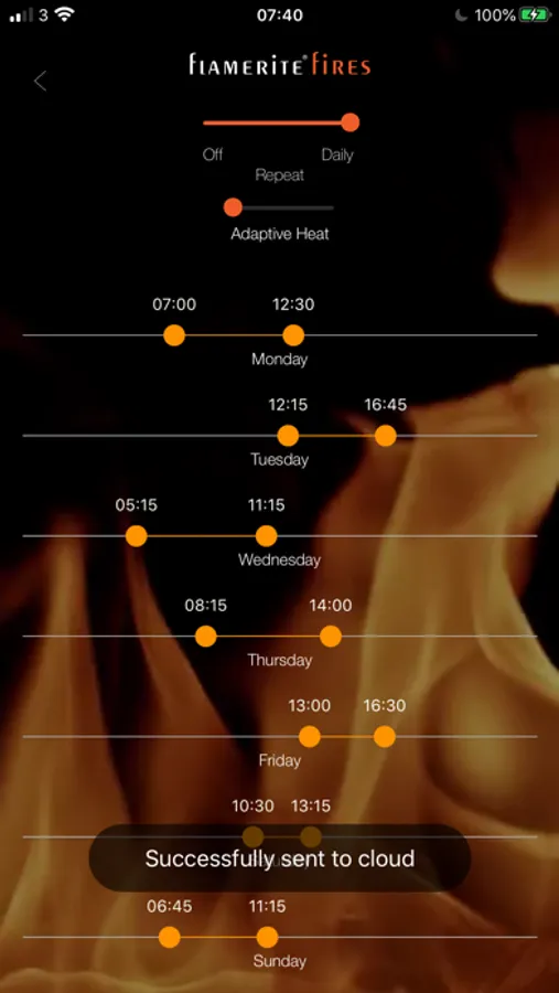 The advanced features of the app allow for thermostatic control of the heater. A seven day timer allowing for an adaptive single event to be set each day. Brightness and colour selection including adjustable set animations.