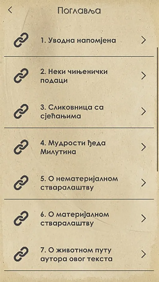The application is based on the monograph Milutin Milutinović - Family Wisdom 1878-1962, ISBN978-9940-640-05-7, published in May 2021, which is the result of a project inspired by the vision of the Montenegrin Academy of Sciences and Arts on research on economic migration of Montenegrins in 19. and the 20th century. The application provides the user with 128 wisdoms of the grandfather Milutin originating in centuries-old folklore in Milutin Milutinovic's narration, as well as on his personal experience gained in Montenegro and America.