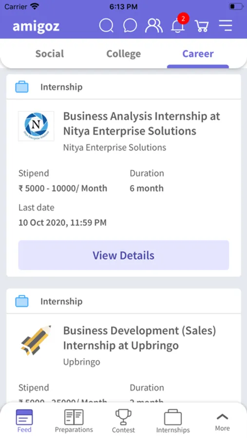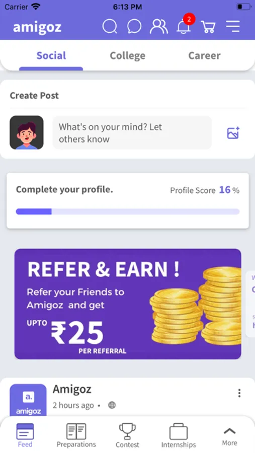 You can invite your college friends, find new friends, chat with them. You can also find Internships, College Fests, Webinars, Events, Scholarships, Competitions all at one place instead of jumping like a rabbit from one place to another.