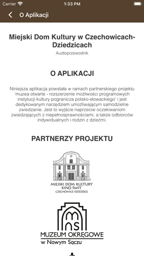 Niniejsza aplikacja powstała w ramach partnerskiego projektu "muzea otwarte - rozszerzenie możliwości programowych instytucji kultury pogranicza polsko-słowackiego" i jest dedykowanym narzędziem umożliwającym samodzielne zwiedzanie. Jest to wyjście naprzeciw oczekiwaniom zwiedzających z niepełnosprawnościami, a także odbiorców indywidualnych i rodzin z dziećmi.